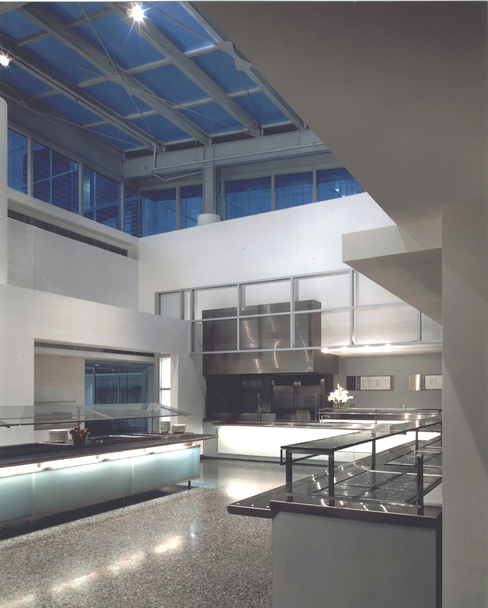 This corporate Dining Facility was designed to be a convertible space; a commissary for employees during the day, and occasionally the dining room portion became an event space at other times. Banquettes and dividers were all movable. A rolled up scrim comes down out of the top of an open gridded divider between the Servery and Dining Room, screening off the Servery when there are special functions in the Dining Room. The greenhouse design provides an open and outdoor feel to the space. Stainless steel, glass and white terrazzo create a bright palette of materials in the Servery. In the Dining Room, horizontal paintings of Texas landmarks by Constance Mallinson alternate with bold colored panels lining the top of the divider walls, creating a colorful dynamic graphic band from a distance and intriguing detailed paintings when viewed at close range.